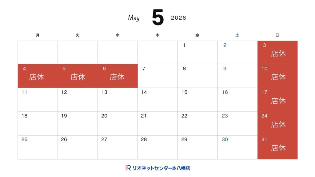 2026年5月の店休日のご案内です。日曜・祝祭日がお休みになります。